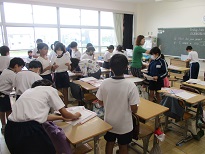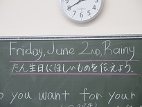 5年生の外国語の授業です。今日は、「誕生日に欲しいもの」を友達に聞く活動です。みんな積極的に英語を使って話していました。