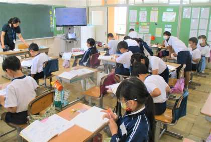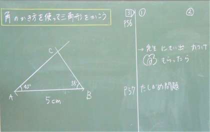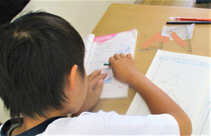 4年生の算数の授業です。今日は、これまでに学んだ角の書き方を活用して三角形を描いています。みんな真剣に取り組んでいます。