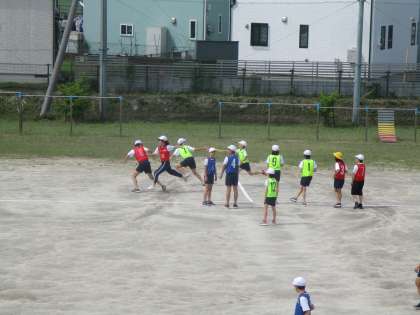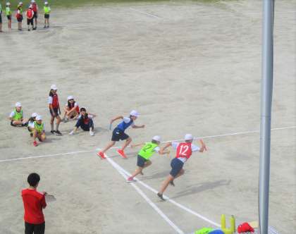 6年生の体育の授業です。今日は、陸上運動のリレーに取り組んでいます。ルールを工夫し、全員が楽しめるようなルールで全員が一生懸命走っています。頑張れ!