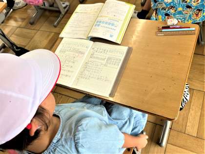 2年生の算数の授業です。今日は、大きな数を10のいくつ分かで表すことがめあてです。ノートに自分のやり方を書いて、みんなで見合っています。みんな上手に書いています!