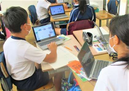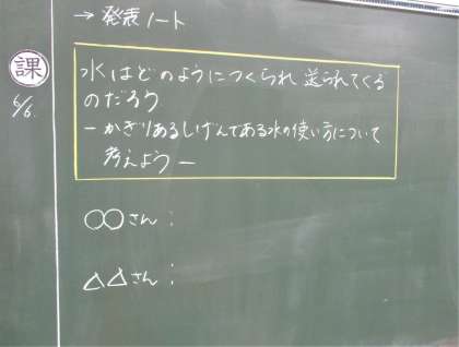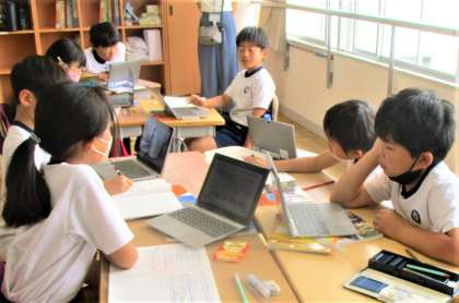 4年生の社会の授業です。今日は限られた水資源の有効的な活用の仕方について、タブレットを活用して調べ、発表ノートにまとめています。みんな頑張ってまとめています。