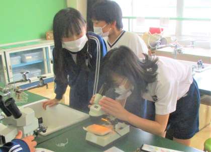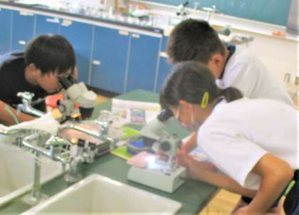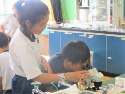 5年生の理科の授業です。今日はこれから顕微鏡を活用した実験に備えるために、顕微鏡の使い方を試しています。みんな興味津々です。