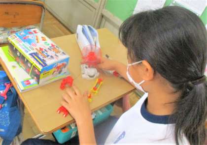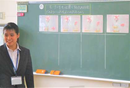 4年生の理科の授業です。今日は、モーターを速く回すには電池をどのようにつないだらよいだろうか?という課題に取り組んでいます。みんな模型を活用して試行錯誤しています。予想を立て、試行錯誤することが大事です。