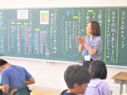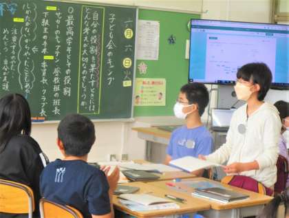 6年生の道徳の授業です。今日は「子ども会のキャンプ」という読み物資料を活用して自分の役割を果たすときにはどんな考えが必要なのだろうか?ということについて話し合っています。みんな積極的に意見を出し合っています。