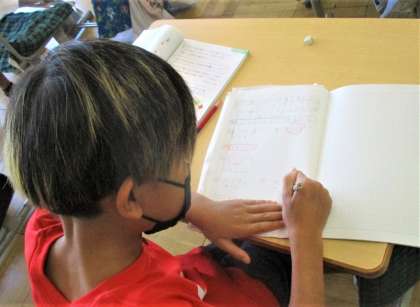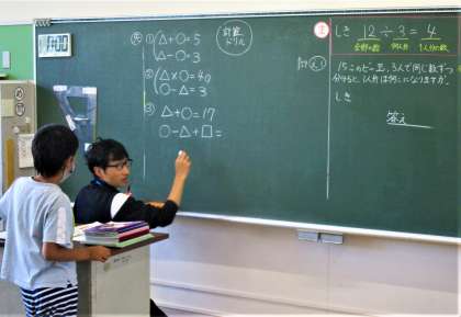 3年生の算数の授業です。今日は、割り算についての学びです。みんな問題に一生懸命取り組んでいます。頑張ってます!