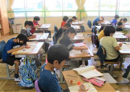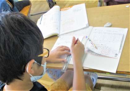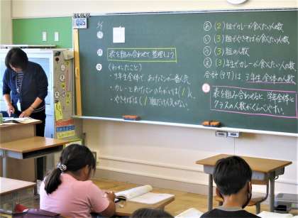 3年生の算数の授業です。今日は、いくつかの表を見て比べてわかることをノートに書きだしています。みんな一生懸命ノートに自分の考えを書いています。