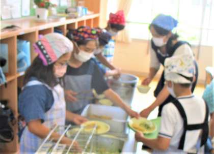 4年生の給食準備・配膳の様子です。当番で和区割りが決まっており、スムーズに配膳が進んでいます。チームワークもいいですね。