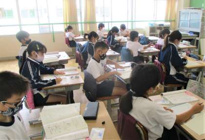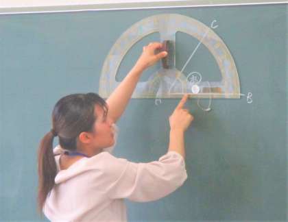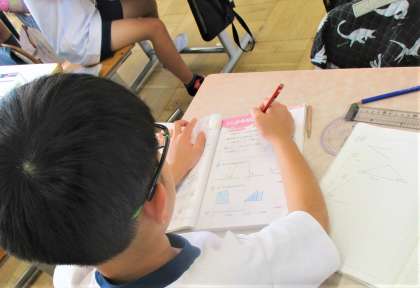 4年生の算数の授業です。今日は、三角形の書き方について学んでいます。先生の説明を聴きながら、しっかりと基本を覚えながら自分らしく三角形を書いています。頑張れ!