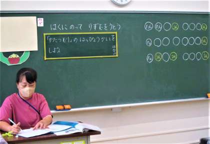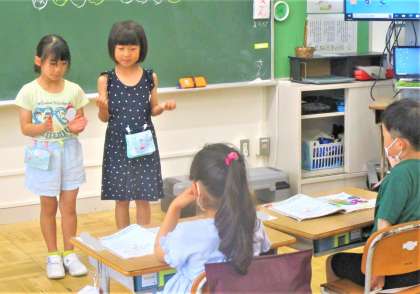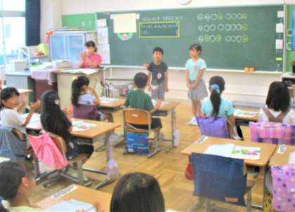 1年生の音楽の授業です。今日は、「かたつむり」を手拍子しながらペアで歌っての発表です。みんなリズムにのって上手に発表しています!