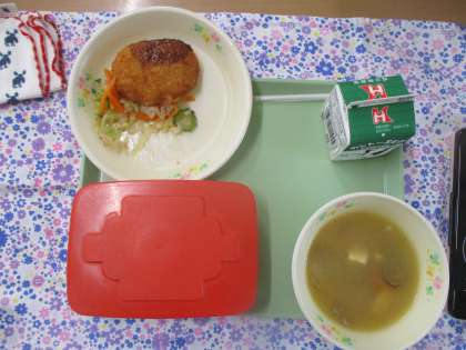 給食の時間です 公開日 2023/06/14 更新日 2023/06/14 学校 2年生の給食の準備・配膳の様子です。当番の役割分担がしっかりしていて、意欲的に準備・配膳に取りかかっています。今日の献立は「ごはん、牛乳、野菜コロッケ(ソース)、キャベツのおかか和え、豚汁」です。