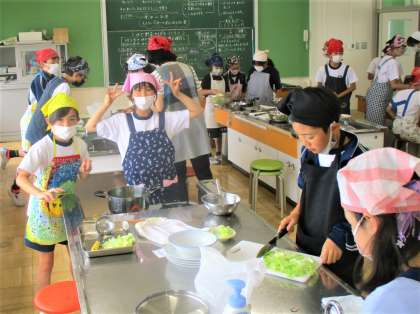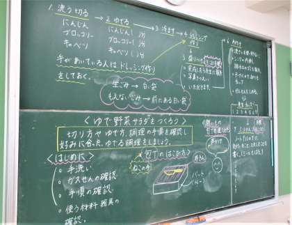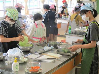 5年生の家庭科の授業です。今日は、初めての調理実習に取り組んでいます。みんな真剣に、そして楽しみながら「ゆで野菜」の調理実習に取り組んでいます。みんな頑張ってます!