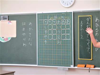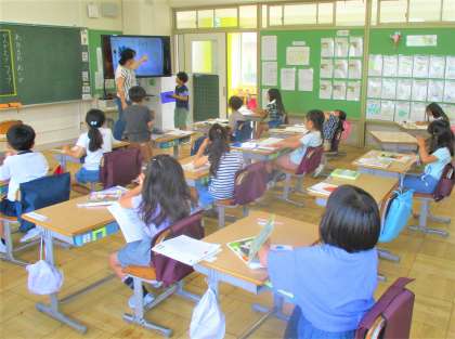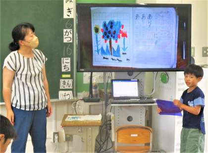 1年生の国語の授業です。「あひるのあくび」で50音を語呂合わせで学んでいます。今日は、仲間たちが考えた「あ」行の語呂合わせを、書画カメラを活用してみんなで共有しています。みんな集中しています。