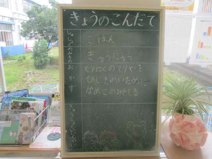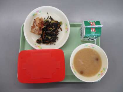 今日の給食は、ご飯、牛乳、鶏肉の照り焼き、ひじきの炒め煮、なめこのみそ汁でした。 おいしくいただきました。