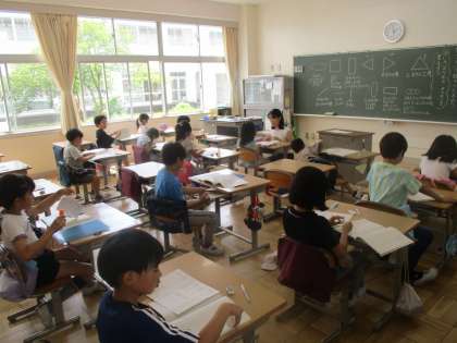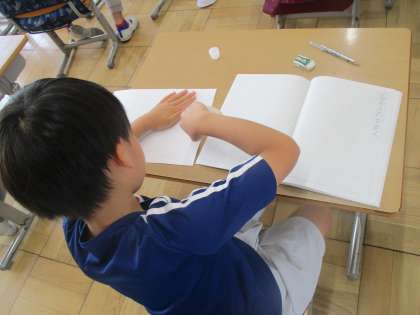 2年生の国語の授業です。「ことばで絵を伝えよう」の単元です。今日は、いろいろな形の説明を考えます。ワークシートをノートに貼り付け、さあ思考開始です。ファイト!