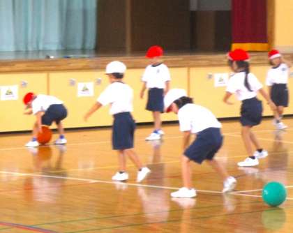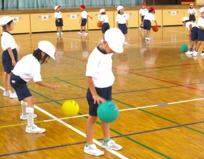 1年生の体育の授業です。今日は、体つくり運動の用具を操作する運動を行っています。みんなボールの扱い方が上手になってきましたね。次は、ゲームができますね。