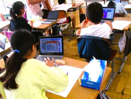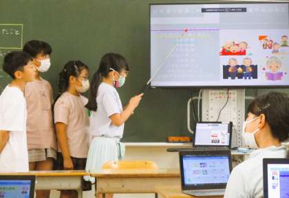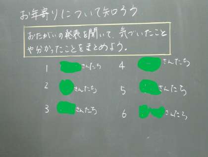 4年生の総合的な学習の時間です。福祉についての探求的な学びです。今日は、お年寄りについて調べたことを班ごとに発表しています。緊張せず頑張れ!