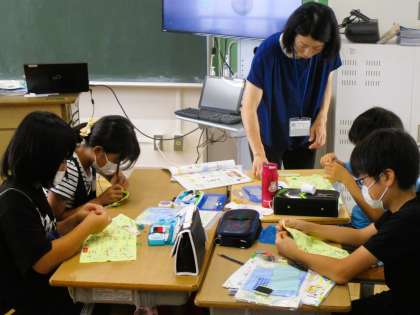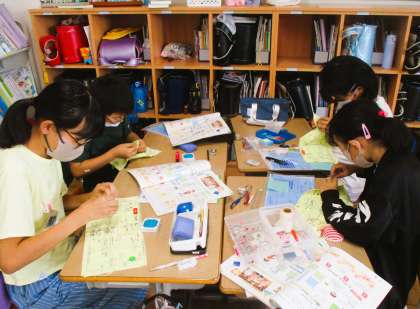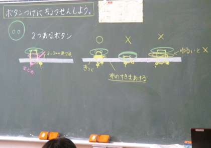 5年生の家庭科の授業です。衣食住の衣の学びです。今日は、針と糸を活用して、ボタン付けの実習です。みんな一生懸命取り組んでいます。集中です!