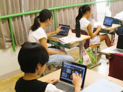 6年生の外国語の授業です。今日は、タブレットの発表ノートを活用して、「思い出のアルバム」のスライドを作成しています。英語表現を活用しながら集中して取り組んでいます。頑張れ!