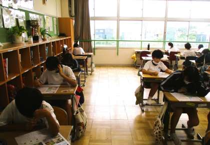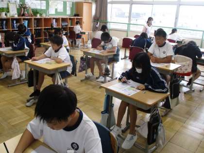 6年生の社会の授業です。今日は、単元テストに取り組んでいます。頑張れ!