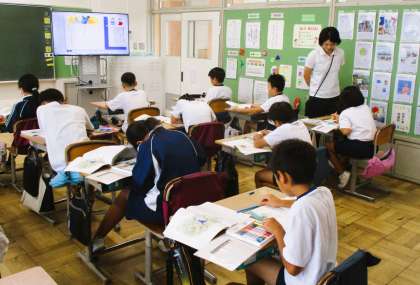 4年生の国語の授業です。「一つの花」という物語を読んでいます。今日は、物語を読んでイメージする一つの花をノートに描いています。みんな一生懸命取り組んでいます。