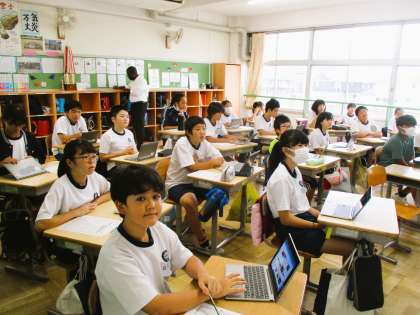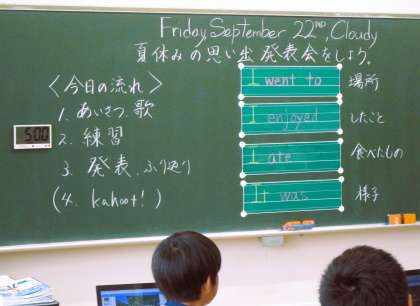 6年生の外国語の授業です。今日は、タブレットを活用して作成した「夏休みの思い出アルバム」を、英語でプレゼンしています。みんな、堂々と身振り手振りを交えながら一生懸命プレゼンしています。素晴らしい!