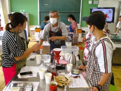 まずは、コーヒーに関する歴史や知識をお話しいただきました。「なるほど!」と思う興味深いお話でした。そして、実際にコーヒーを淹れる時間となりました。コーヒーの淹れ方を実践を通して学ばせていただきました。5つのグループがありましたが、5つともコーヒーの味が違います。入れる方の個性や淹れ方でこんなにも違うものかと実感を伴って理解しました。また、各グループのコーヒーを試飲する中で、様々な交流もできました。