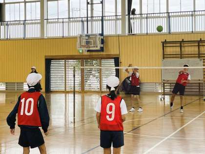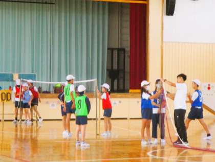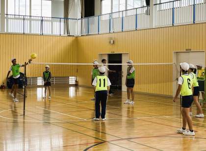 6年生の体育の授業です。「ボール運動」の「ソフトバレーボール」に取り組んでいます。簡易なルールを行っています。技能を高めるための工夫で、少人数や導入での工夫をしています。仲間たちも準備・片付け、ゲームの取り組みなどみんなで協力して行っています。「仲間意識」がありますね。