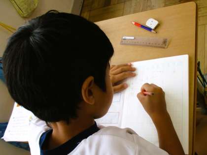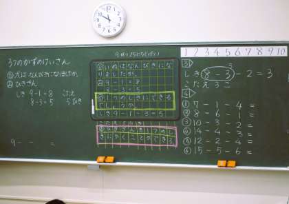 1年生の算数の授業です。「3つのかずのけいさん」について考えています。今日は、ひき算も一つの式に出来ることを学びました。みんな頑張りました!