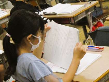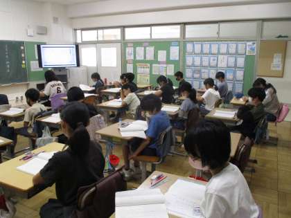 5年生の国語の授業です。今日から「注文の多い料理店」に入りました。まずは、どんな物語なのか、デジタル教科書の音読機能を活用して物語を読んでいます。みんな集中しています。