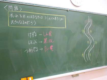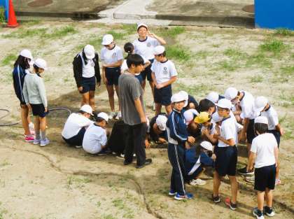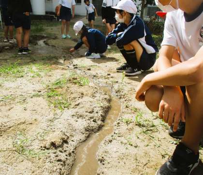 5年生の理科の授業です。「川の流れによる川岸について」の学びです。今日は、中庭に川のモデルをつくり、そに実際に水を流して、川岸がどのようになるか、川の流れはどうかについて観察しています。実感を伴う学びにつながります。先週、担任が中庭を掘っていた理由がわかりました。