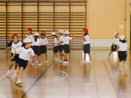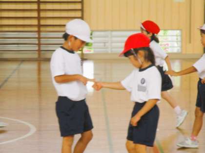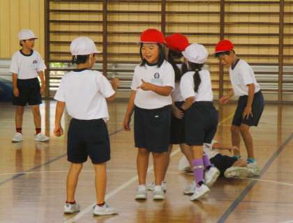 1年生の体育の授業です。1・2組合同での体育です。今日は、鬼遊びを楽しんでいます。みんな夢中になって走り回っています。いい環境で運動ができる季節となってきました。