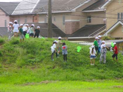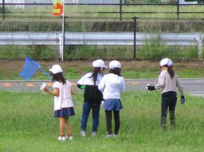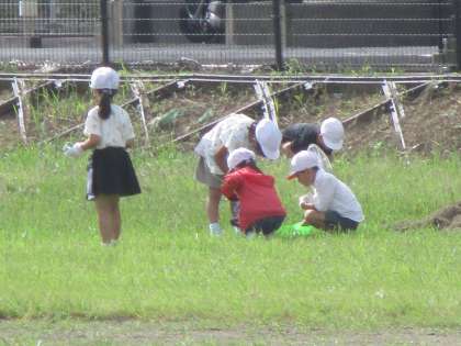 1年生の生活科の授業です。生き物のついての学びです。今日は校庭に出て「虫探し」をしています。みんな楽しみながら様々なことに気づいています。