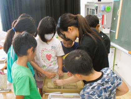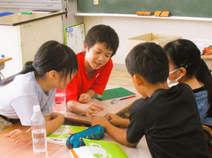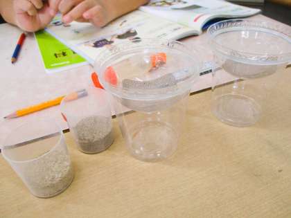 4年生の理科の授業です。チーム指導です。土のつぶの大きさと水のしみこみ方について学んでいます。今日は、実際に大きさの違う土に水をしみこませてどのようになるかを実験します。まずは、予想を立てて、いざ実験です。実感を伴う学びですね。