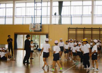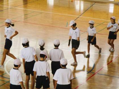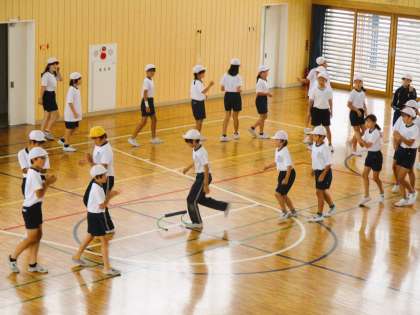 5年生の体育の授業です。合同体育です。今日は「体つくり運動」の「体の柔らかさ及び巧みな動きを高めるための運動」を行っています。8の字跳びです。リズムよく跳べるように、デジタルタイマーを活用しながら、ハードルをリズムよく跳んでいます。これから実際に縄を跳びます。頑張れ!