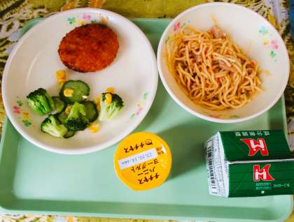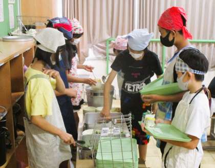 6年生の給食準備・配膳の様子です。当番の仲間たちが仲良く協力して配膳しています。いい雰囲気です。