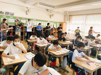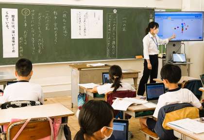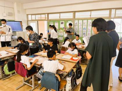 4年生の国語の授業です。今日は教員になって初めての研究授業をしています。堂々と仲間たちに関わり、関わりも柔らかでかつ的確です。「一つの花」という物語を読んでいて、今日は「一つの花という題名にはどのような意味が込められているのか?」について考えています。一人一人が自分の意見をもち、グループで伝え合い、最後に振り返りまでしっかり終えました。仲間たちも先生の発問にしっかり答えていました。学級での先生と仲間たちのよい関わりがとてもよくわかりました。授業は「先生と仲間たちでつくるもの」です!