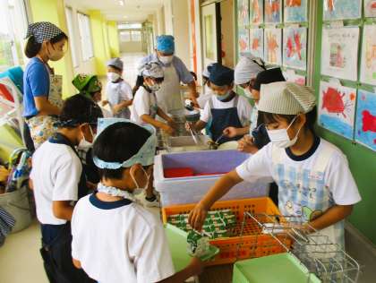 2年生の給食準備・配膳の様子です。当番さんを中心に素早く・手際よく配膳が進みます。今日は、お月見献立です。