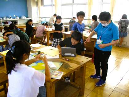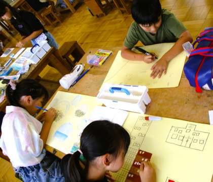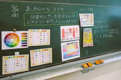 5年生の図画工作の授業です。題材名は「あったらいいな こんな町」です。仲間たちはそれぞれ思い浮かべた想像の町を絵で表現しています。頑張れ!