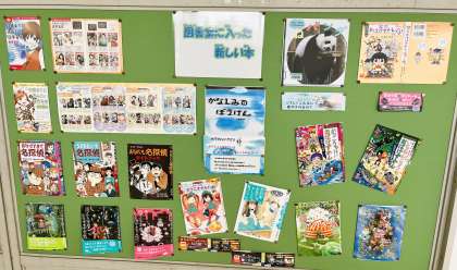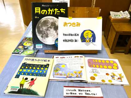 チーム宮和田の学校司書さんは、仲間たちに興味をもってもらえるような様々な工夫をしてくださっています。お月見に合わせたコーナーもありますよ!