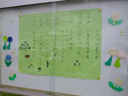 校内掲示板予定表の入れ替え 公開日 2023/10/02 更新日 2023/10/02 学校 環境整備委員会の仲間たちは、体育館横の校内掲示板の月予定表を毎月作成してくれています。今朝、10月の予定表になりました。ありがとうございます!