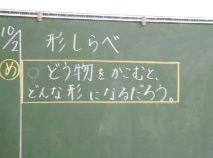 2年生の算数の授業です。図形に関する学びです。今日は形調べをしています。ものを直線で囲むとどのような形になるかを調べています。みんな一生懸命取り組んでいます。