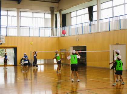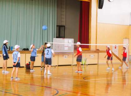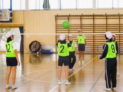 6年生の体育の授業です。「ボール運動」の素保とバレーボールに取り組んでいます。ちょうどグループに分かれて作戦に応じた練習をしているところでした。みんな楽しくそして一生懸命に取り組んでいます。