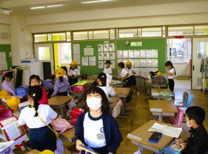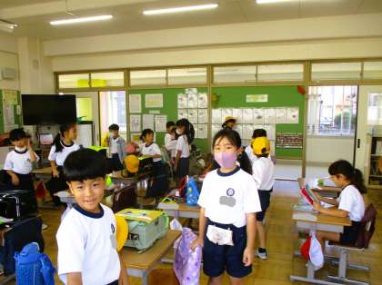 1年生の登校後の様子です。教室に入り、荷物の整理整頓をしています。今日も一日頑張ろう!