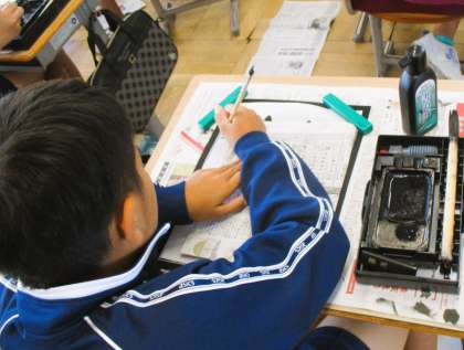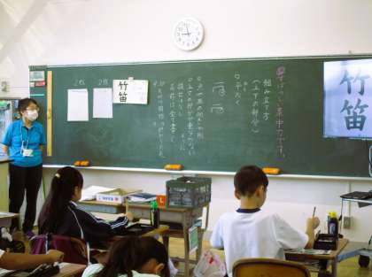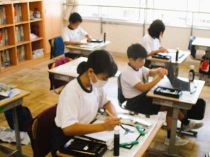 4年生の国語(毛筆)の授業です。今日は、「竹笛」を書いています。画数も多く難しい字ですが、仲間たちは筆遣いのポイントを理解し、しっかり筆を執っています。集中してどり組んでいますね。頑張れ!