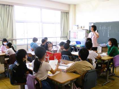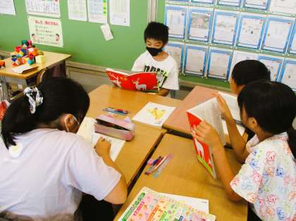 5年生の国語の授業です。「注文の多い料理店」を読んでいます。今日は、グループごとに2人の紳士はどのような性格かわかる文章を選んでいます。グループでの協働的な学びです。頑張れ!