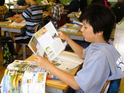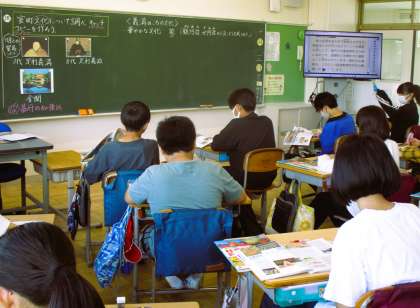 6年生の社会の授業です。歴史分野です。今日は、室町時代の文化を調べてキャッチコピーを考えることが学習課題です。活動に入る前に、室町時代の文化の特徴について協働的に学んでいます。
