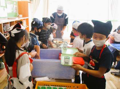 3年生の給食準備・配膳の様子です。当番や協力してくれる仲間たちが力を合わせて準備・配線をしています。チームですね。