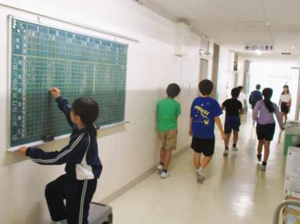 朝の会後、当番の仲間たちが出欠黒板に自分のクラスの人数を記入しに来ます。また、そのあと健康観察板を保健室前の置き場に戻しています。毎日の光景です。ありがとう!