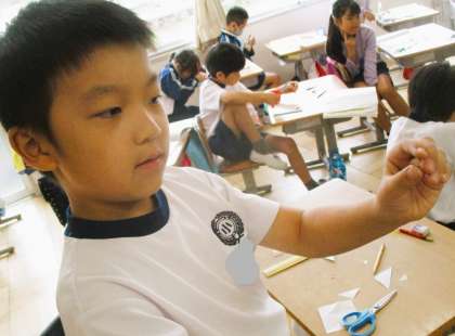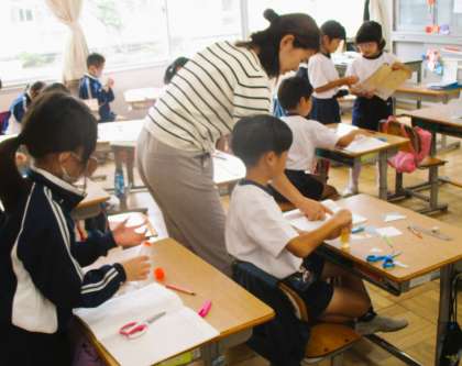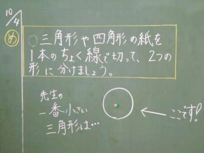 2年生の算数の授業です。図形の学びです。今日は、三角形や四角形の紙を1本の直線で切ったらどんな形になるか、どんな種類になるかについて考えています。小さな図形になるように切っている仲間もいます。みんな課題の意図を理解しながら一生懸命取り組んでいます!