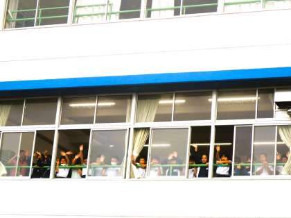 3年生が教室から見送ってくれています。「仲間意識」を感じました。ありがとう!